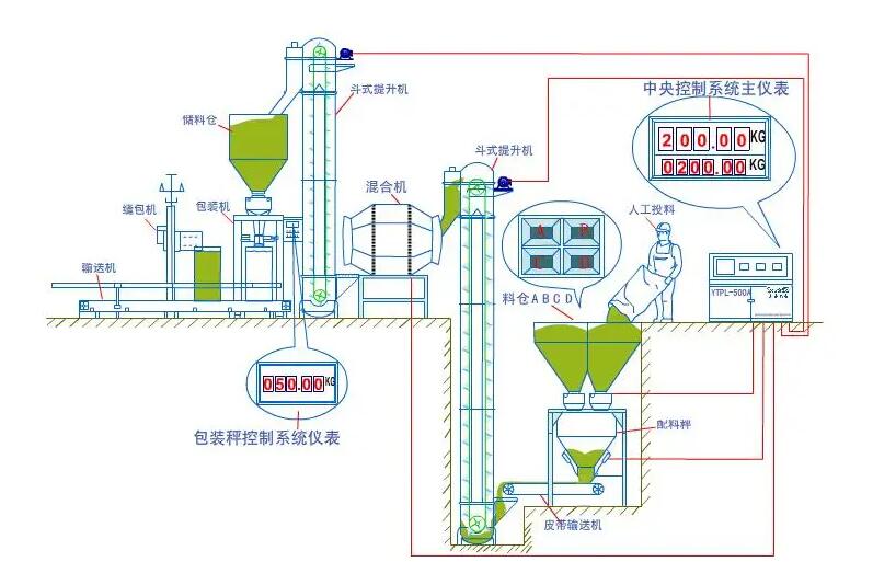 儲(chǔ)料系統(tǒng)→給料系統(tǒng)→計(jì)量系統(tǒng)→輸送提升系統(tǒng)→攪拌混合→自動(dòng)包裝縫包→成品皮帶調(diào)運(yùn)→電腦控制系統(tǒng)。bb肥設(shè)備具有多種規(guī)格,每小時(shí)的產(chǎn)量分別為7-9T,10-14T,15-18T,20-24T,25-30T等;根據(jù)混拌的物料分2~8種物料。